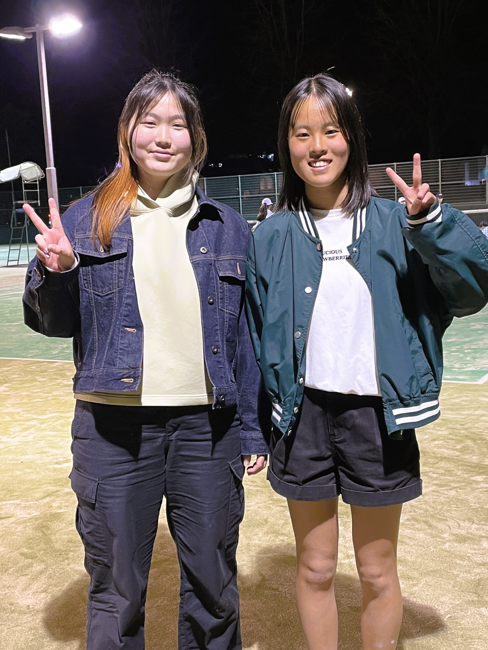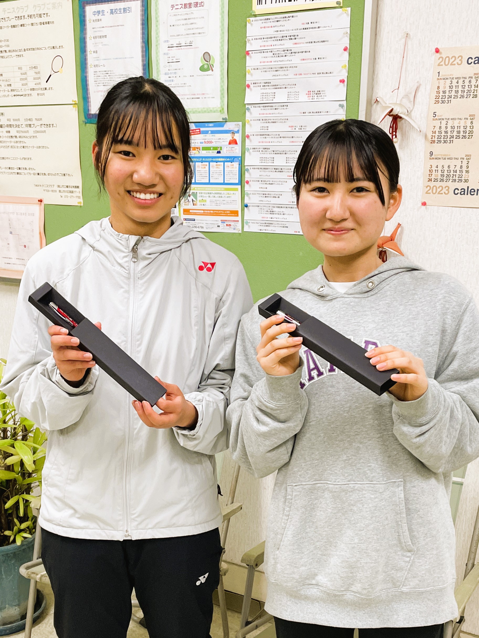 中村若那は岡山城東高校、藤原悠衣は岡山操山高校に進学して、二人とも高校テニス部でがんばります。また、試合会場で会いましょうね。
