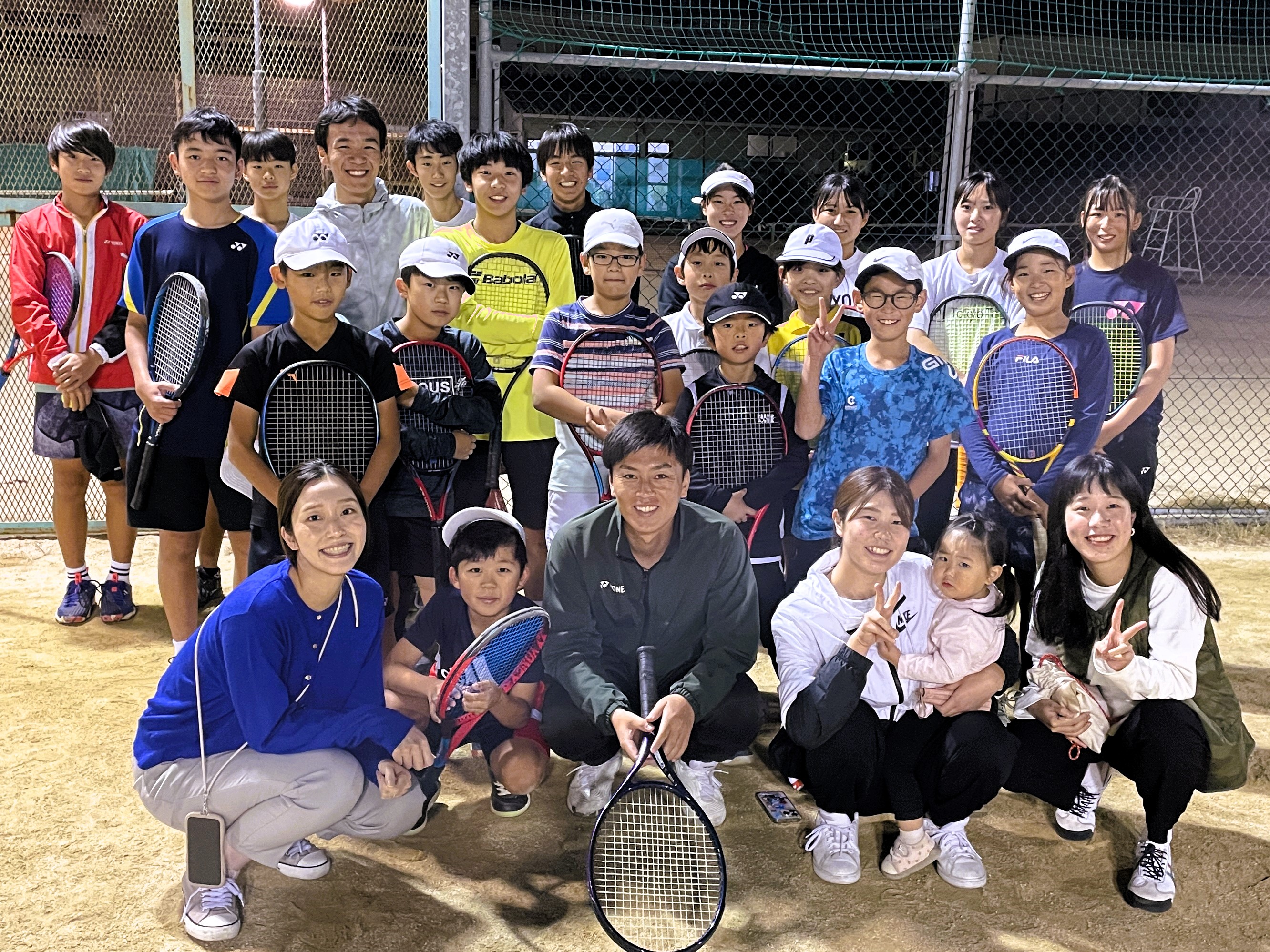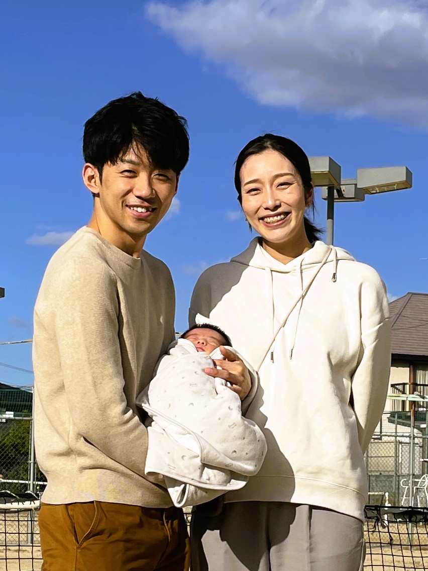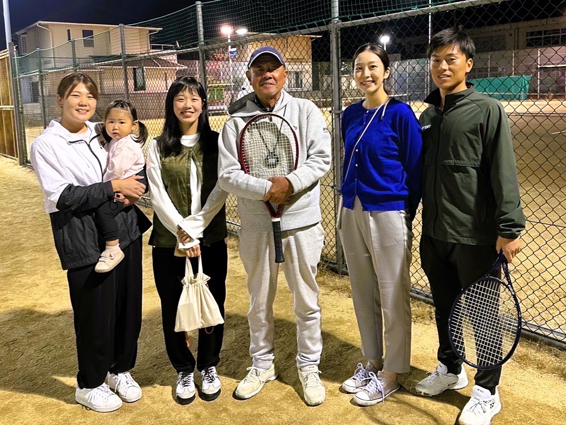 タカヤテニスクラブでの練習が終わることを聞きつけて、ご家族で駆けつけてくれました。中央の湊(ソウ)くんはなんと生後17日です。ご主人の慧(ケイ)さんは、少しの言葉を交わしただけで素晴らしい人間性が伝わってくる方でした。岡山大学の医学部は人材の宝庫ですね。