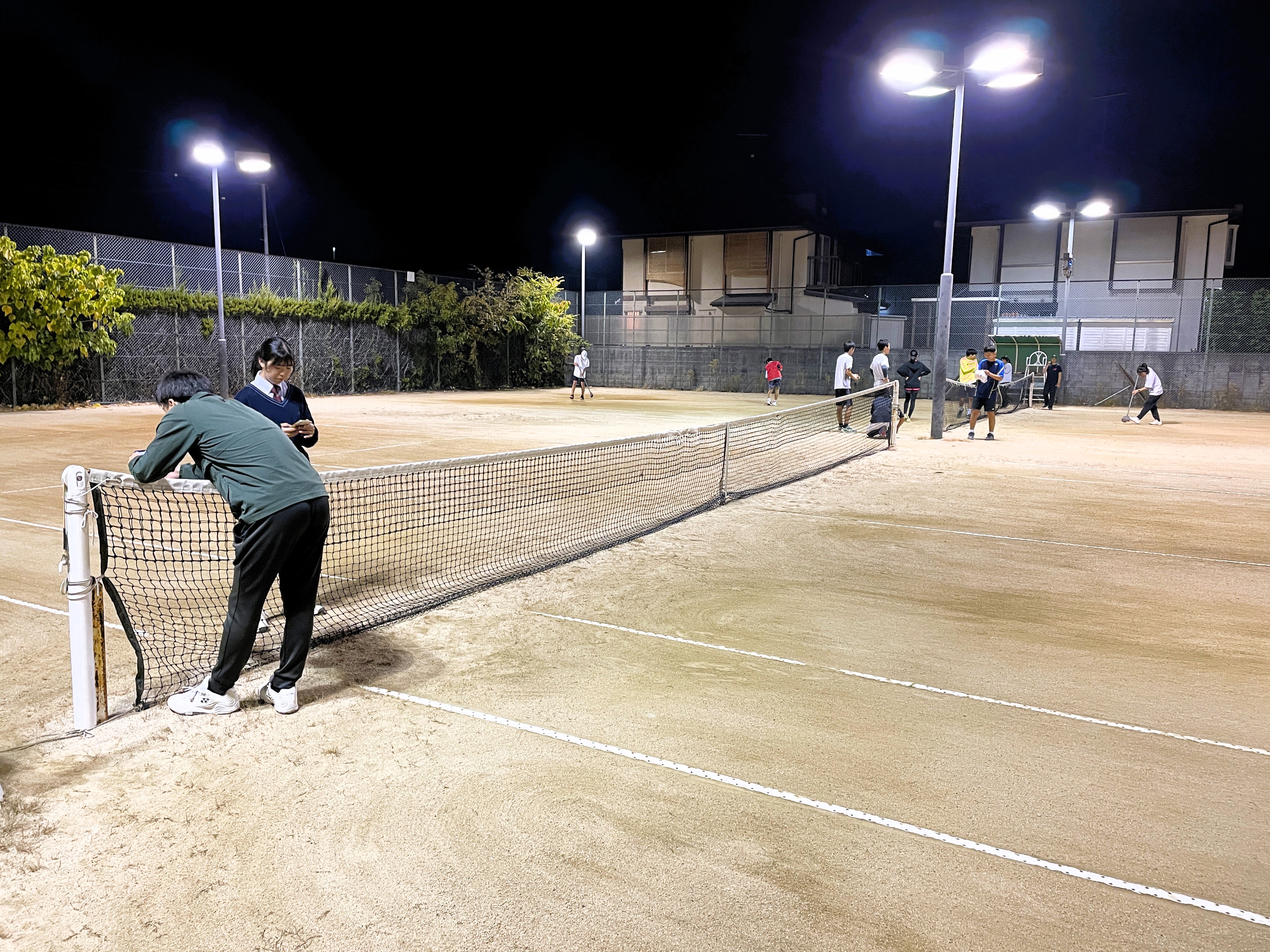 みんなでコートにブラシをかけてラインをほうきで掃いてネットを下ろして終わりました。