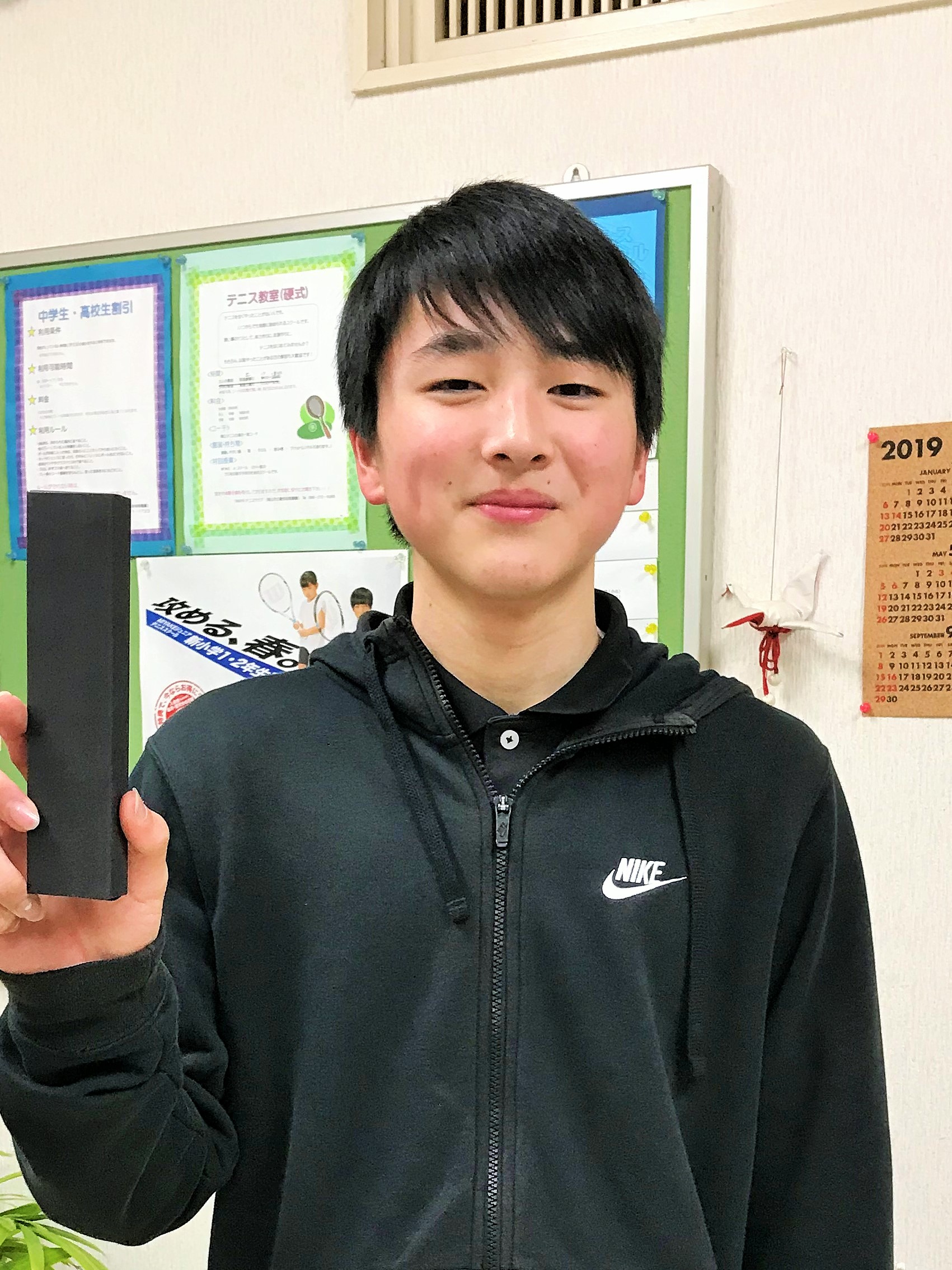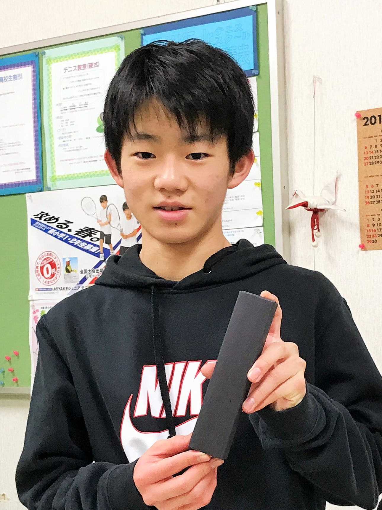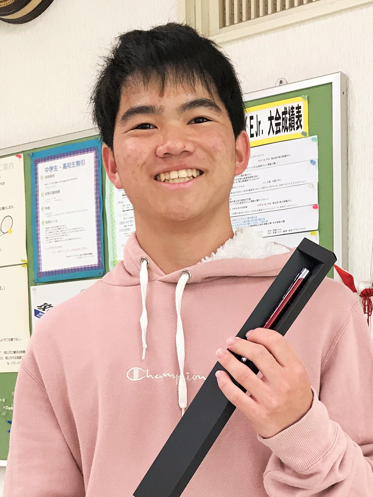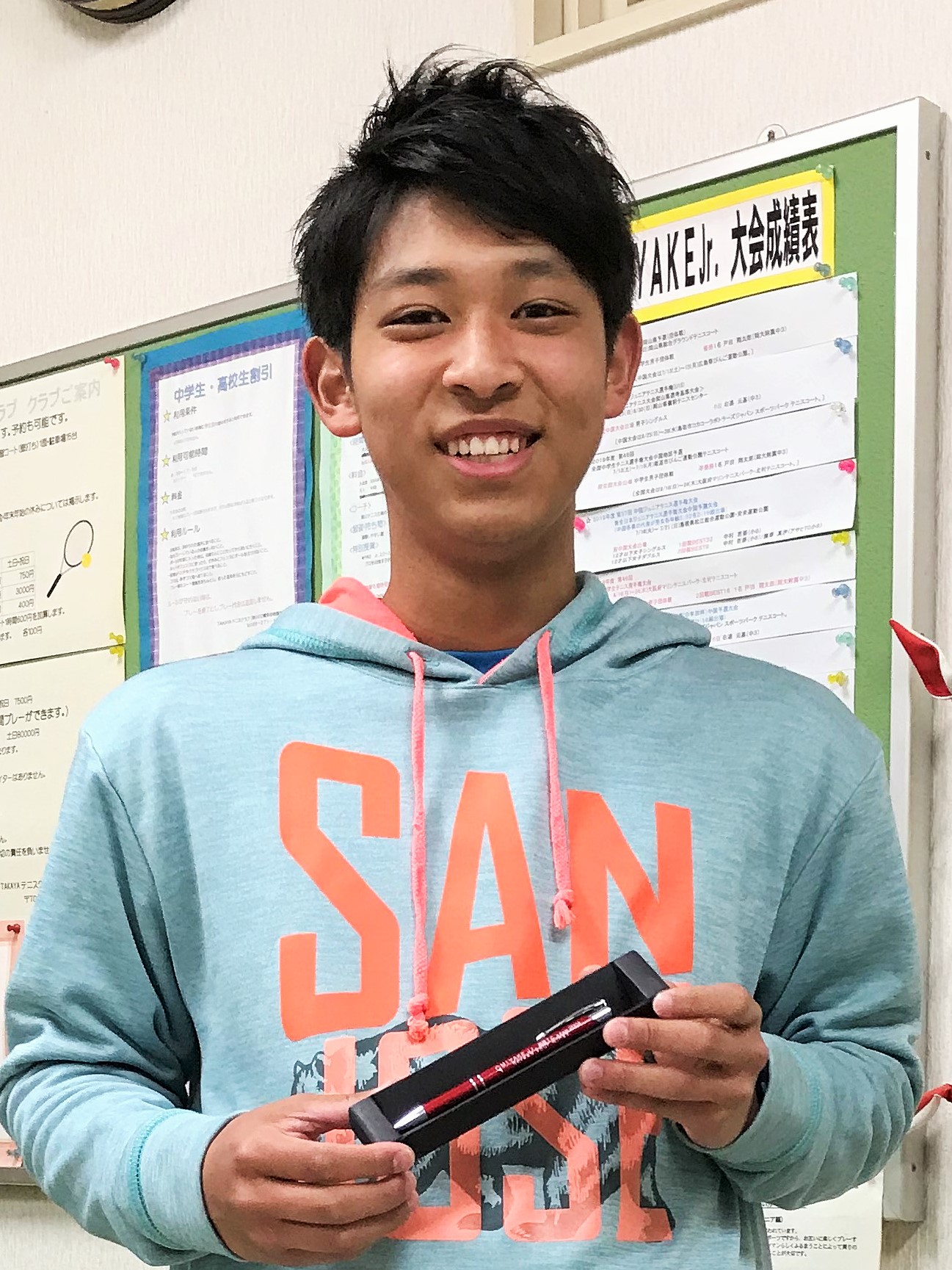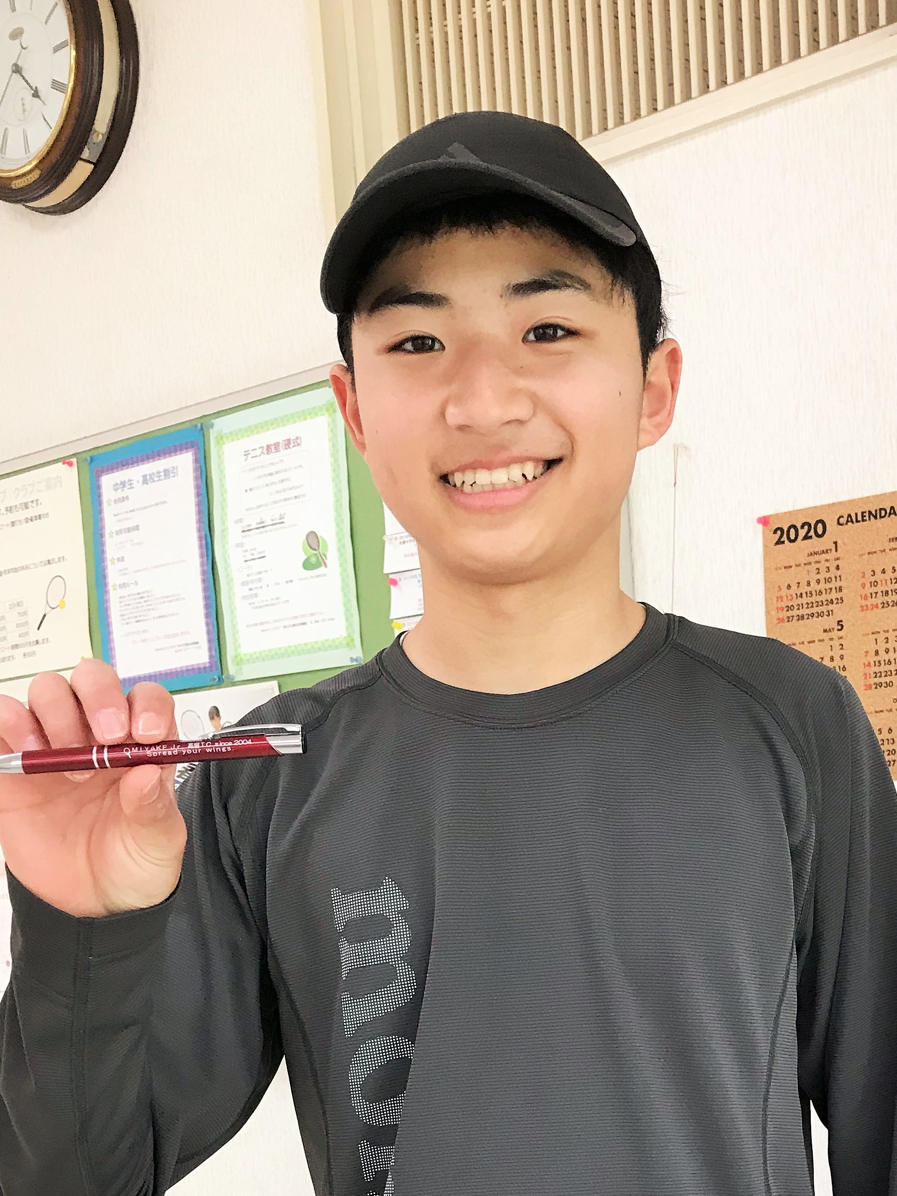 Yクラス卒業で記念のペンを進呈しました。岡山朝日高に進学してテニス部に入ります。全国中学生テニス選手権大会の団体戦で全国大会に出場できました。いい思い出と自信になりましたね。